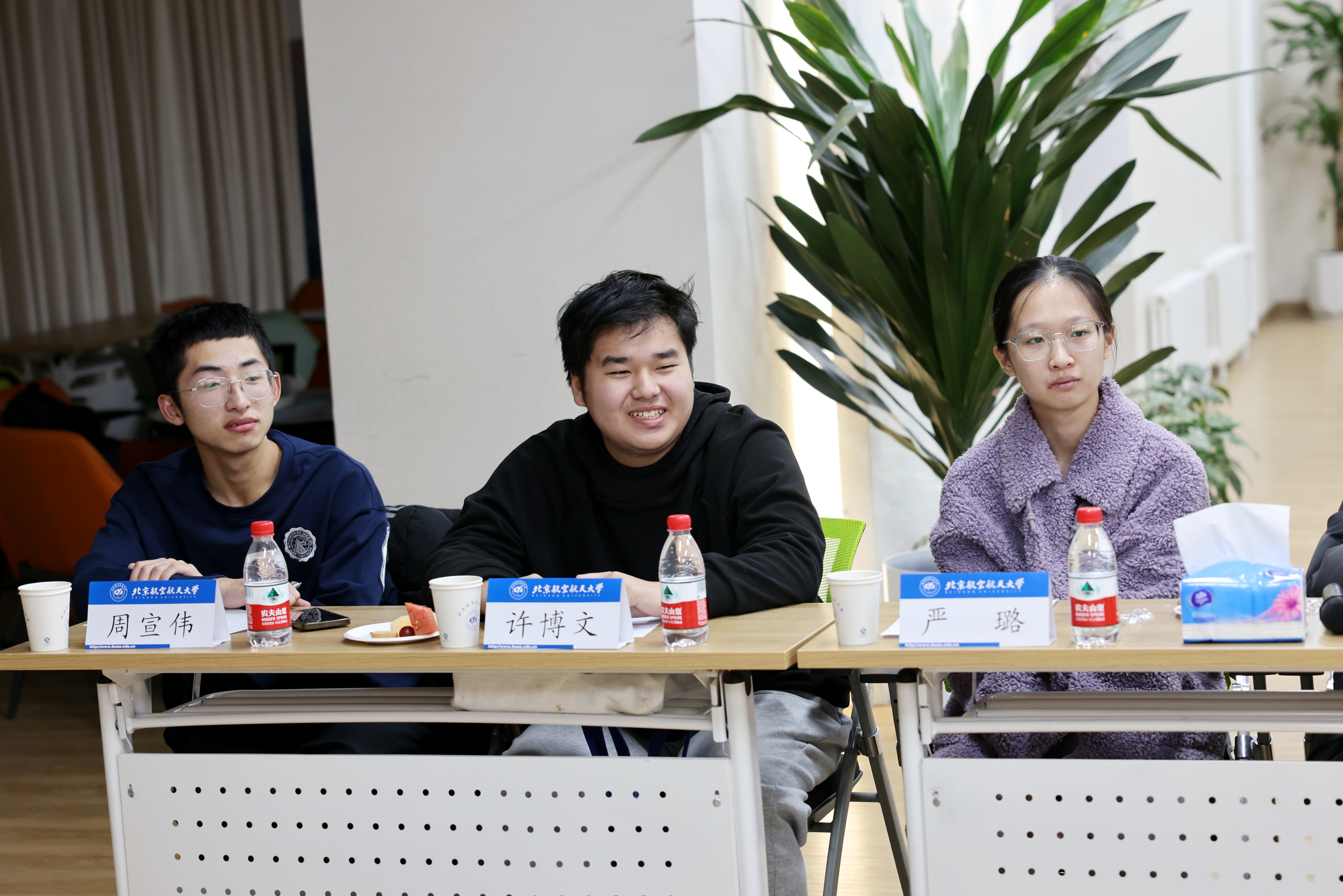 同学们逐一分享了到北航三个月以来的收获和思考,现场气氛热烈。守锷书院廖梓淞、士嘉书院黄乾钊提出了在大一参加科研实践的期待。冯如书院刘恒、守锷书院邱华蕾希望有更多机会走进各专业学院的实验室,以便在专业选择时明确方向。冯如书院王紫暄谈到,在完成课程大作业的过程中,感到自己在资料查阅、文献综述等方面仍需提升能力,且需要加强与其他同学的交流讨论。传源书院周宣伟分享了参加《启航学堂》的感受,并对进一步开放慕课资源提出了建议。