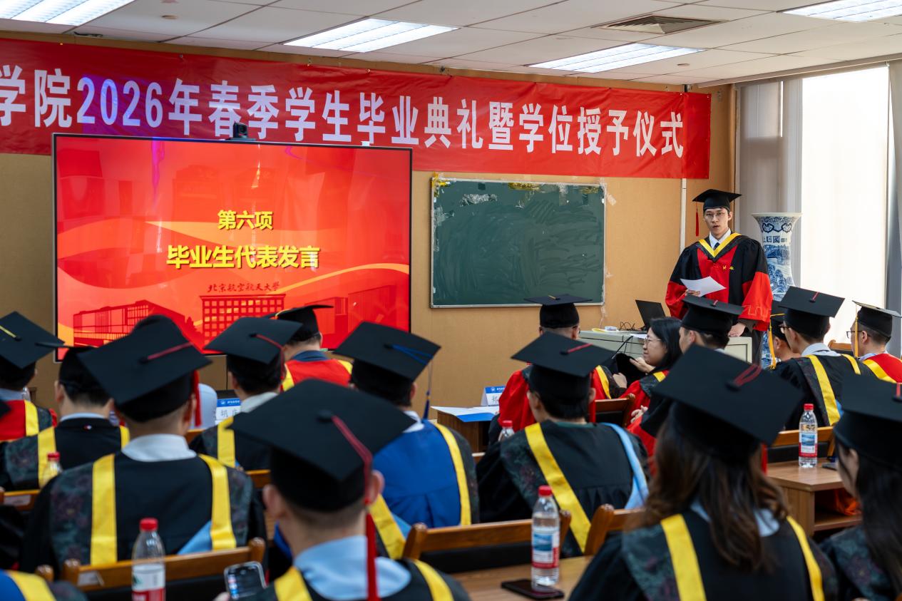 毕业生代表、2021级博士研究生董家宝发言。作为一名在北航度过整整十个春秋的学子,董家宝深情回顾了自己从2016年进入沈元学院,到坚定选择williamhill中国官方网站,最终从一名青涩的“做题家”成长为主持国家自然科学基金青年员工项目、斩获国家奖学金的科研工作者的蜕变历程。他感慨道,比荣誉更珍贵的是在北航探索未知、深度钻研的那股劲头。面对未来,他立志秉承“坚守空天志,敢为天下先”的号召,将北航人的坚韧与执着带入广阔天地,为建设世界科技强国贡献力量。