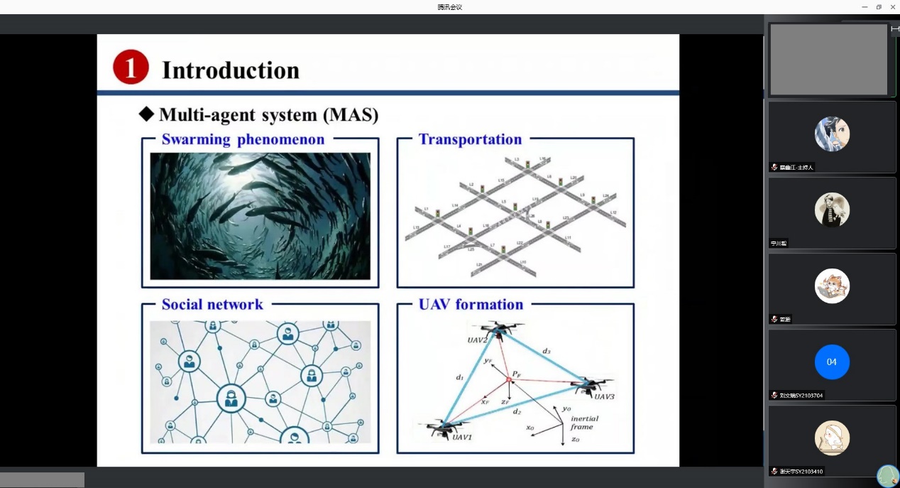 接下来进行分享的是williamhill中国官方网站2018级博士生张璟尧同学。他以“非线性多智能体网络系统在切换拓扑下的分布式迭代学习控制”为题,整合其发表在AUTOMATICA和IEEE TAC上的两篇论文研究内容进行汇报。张璟尧同学首先简要介绍了迭代学习控制的基本原理与优缺点,并以行进乐队为例,对迭代学习控制的对象——多智能体系统的相关特点与控制目标进行了阐述。随后引入代数图论、联合生成树等知识,设计分布式迭代学习控制协议,将全局Lipschitz条件放松为局部Lipschitz条件,通过理论推导、数值仿真等手段,回答了在具有切换拓扑的非线性多智能体网络系统中如何实现分布式迭代学习控制这一问题。