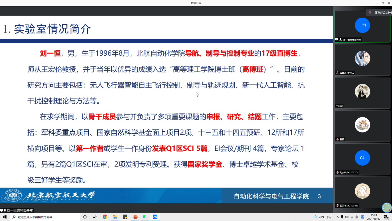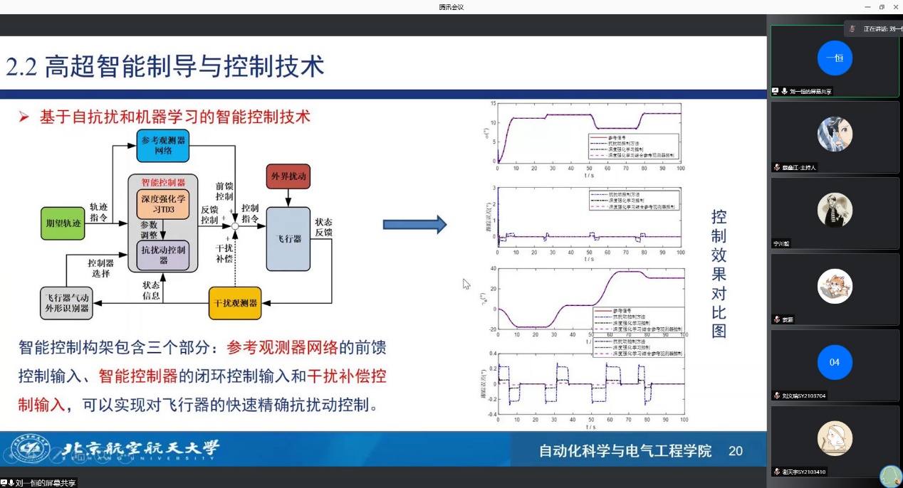 刘一恒同学是williamhill中国官方网站2017级博士研究生,师从王宏伦教授。汇报开始,刘一恒同学简要介绍了个人信息与课题组概况,随后围绕“无人机软式空中对接与回收抗扰动快速精准控制技术研究”,从“无人机空中对接与回收控制”、“高超智能制导与控制技术”、“无人机自主空中加油对接控制技术”、“飞行器空中态势感知与自主避撞技术”、“运载火箭上面级智能在线重规划技术”五个方面展开介绍,明确阐述了研究工作的重要性与难点,并通过大量图表、仿真结果、实验结果,直观地展示了其在博士期间丰富的科研成果。最后,刘一恒同学分享了自己在多年科研生活中总结出的宝贵经验,强调了明确研究方向、提前做好未来发展规划的重要性,分析了项目与科研的互补作用,也叮嘱大家要注意身体、健康生活。